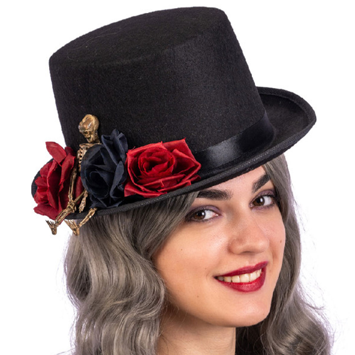 Höghatt Skelett och Rosor omfattar en svart höghatt gjort i filtmaterial samt ett svart band. På sidan av hatten sitter det ett skelett mellan två röda rosor och en svart ros.