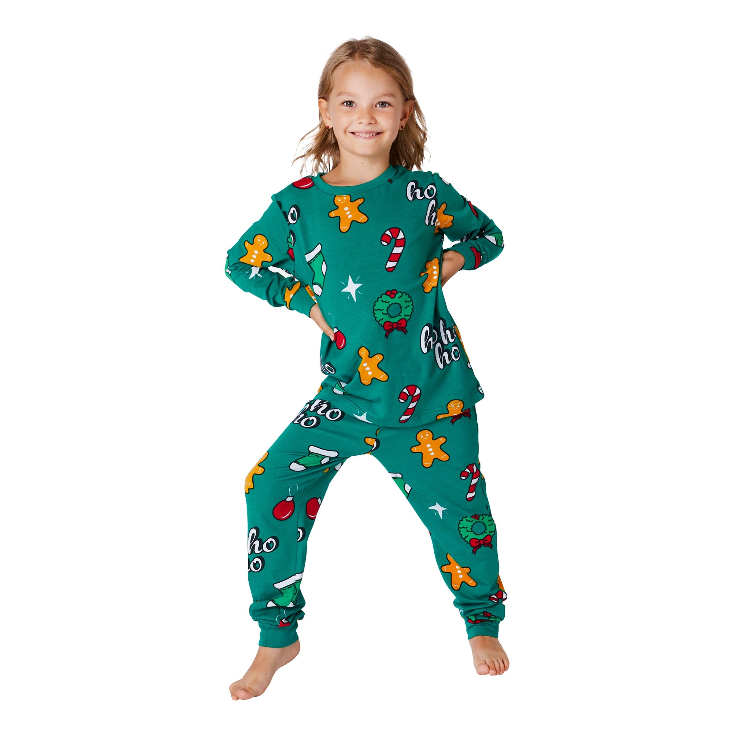 Hohoho Grön Julpyjamas för Barn är en härlig pyjamas i två delar i bomullsmix som gör den supermjuk och behaglig mot kroppen. Pyjamasen är i grön färg och tryckt med olika roliga julmotiv av bland annat pepparkakor, julkäppar, julkulor och texten "Hohoho". Passar lika bra som mysplagg på julaftonskvällen som att sova i.