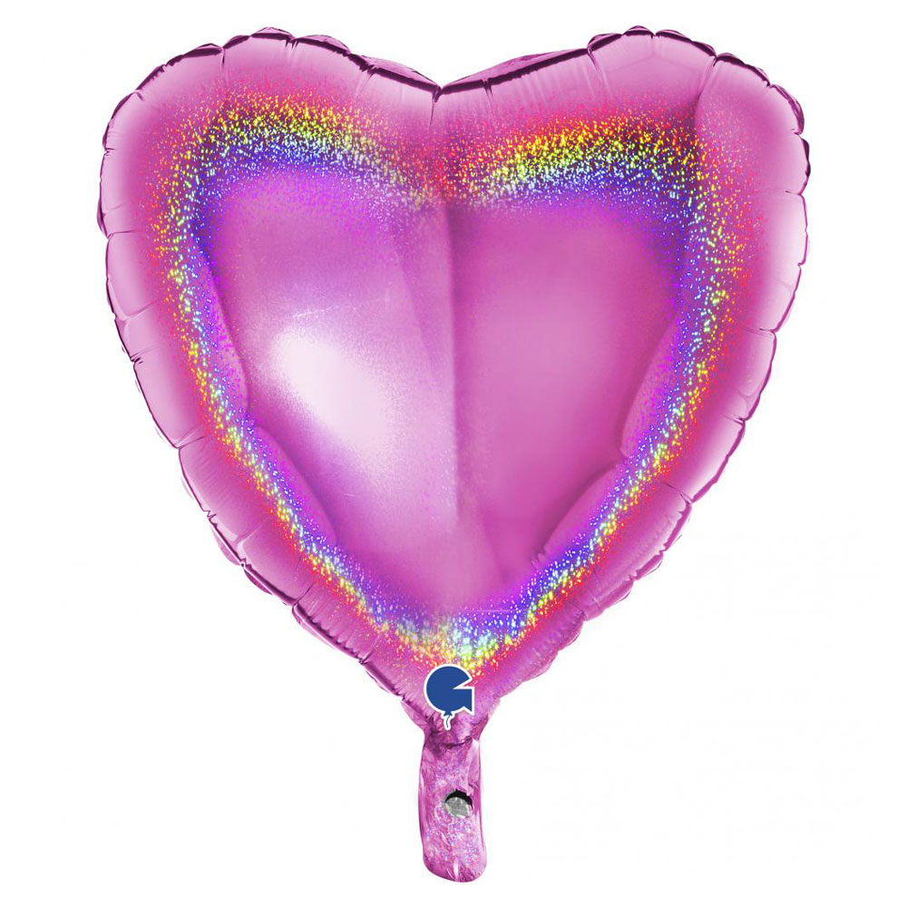 Holografisk Folieballong Hjärta Fuxia Rosa omfattar en hjärtformad folieballong i skimrande holografiskt rosa. Blås upp ballongen med luft eller helium.