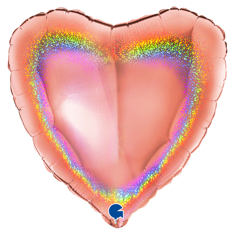 Holografisk Folieballong Hjärta Roséguld omfattar en hjärtformad folieballong i glittrigt holografiskt roséguld. Tillverkad av folie.