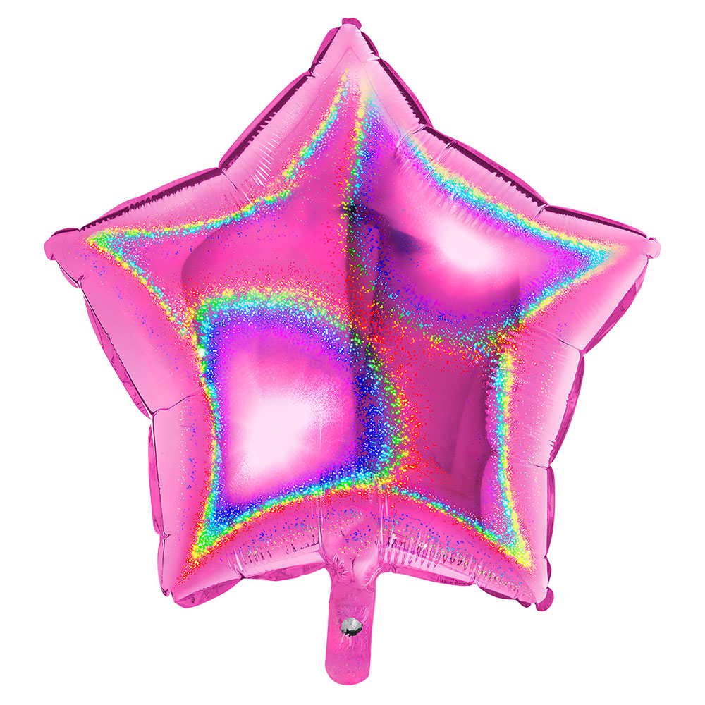 Holografisk Folieballong Stjärna Rosa omfattar en 46 cm stor folieballong i rosa med glittrande holografisk effekt. Ballongen är självförslutande och rekommenderas att fyllas med helium.