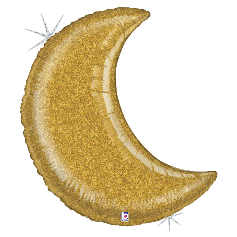 Holografisk Måne Folieballong Guld omfattar en holografiskt glittrig folieballong i form av en guldig måne. Ballongen fylls med luft eller helium och blir ca 107 cm hög och 65 cm bred uppblåst.