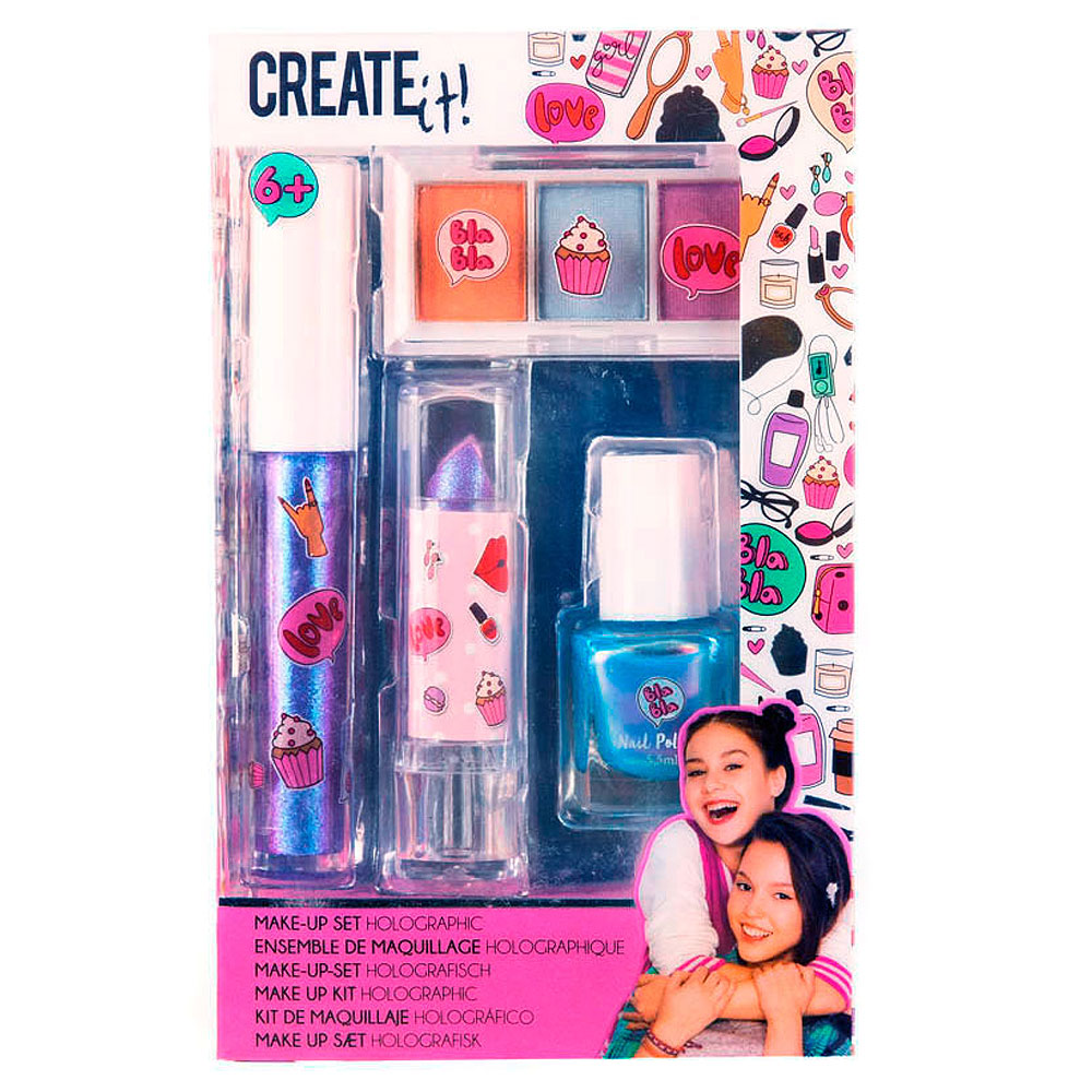 Holografiskt Sminkset Barn omfattar ett barn-sminkset med en ögonskuggspalett, ett holografiskt läppglans, ett holografiskt läppstift och ett holografiskt nagellack.