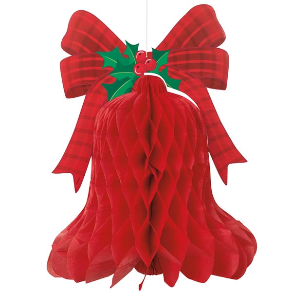 Honeycomb Dekoration Julklocka omfattar en röd honeycomb i form av en julklocka med stor papp-rosett upptill med rutmönster. Dekorationen är tillverkad av papp och är ca 39 cm hög samt 28 cm bred. Upphängningssnöre medföljer.