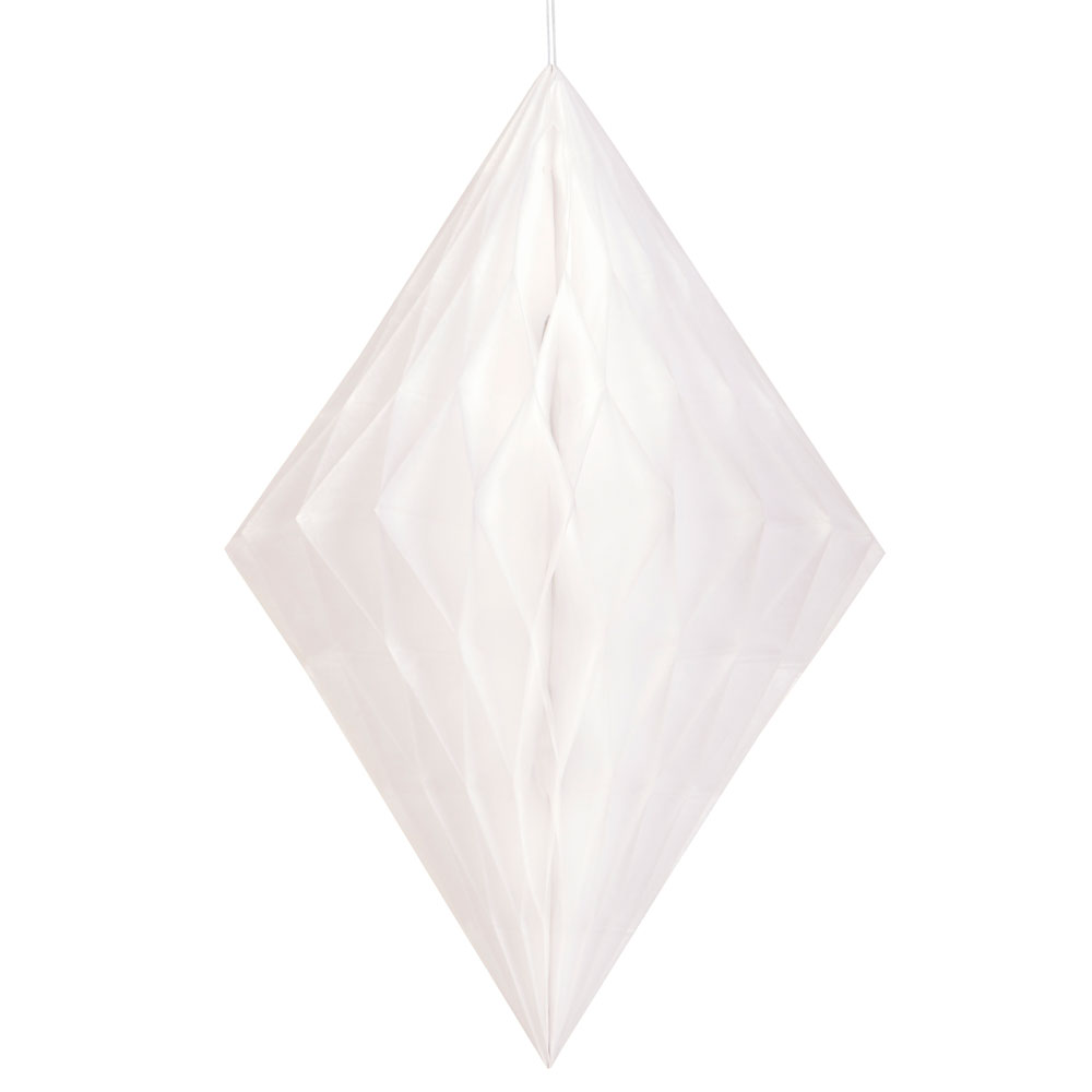Honeycomb Diamant Vit består av en vit honeycomb dekoration i form av en diamant. Vik enkelt ut honeycomben till sin fulla form och häng sedan upp den med hjälp av det lilla snöret som sitter fast i dekorationen. Dekorationen är tillverkad i papp.
