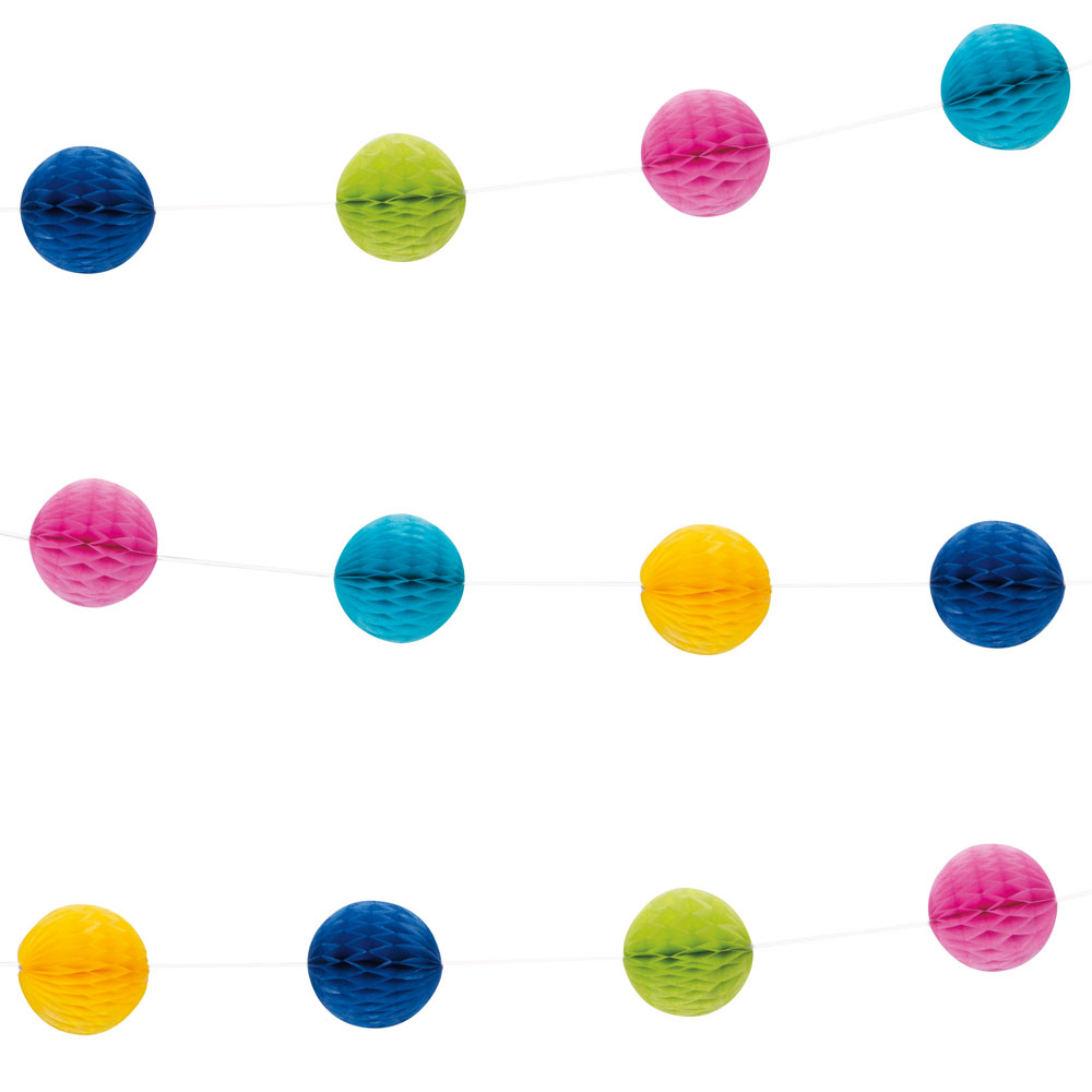 Honeycomb Girlang Multifärgad består av en girlang med honeycomb pappersbollar i olika färger och ett vitt satinsnöre för att hänga upp den.