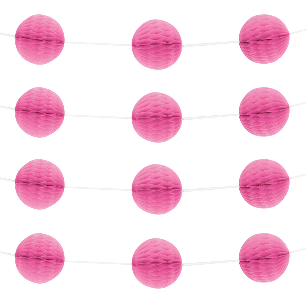 Honeycomb Girlang Rosa innefattar en honeycomb girlang i rosa med ett vitt snöre som gör det enkelt att hänga upp dekorationen.