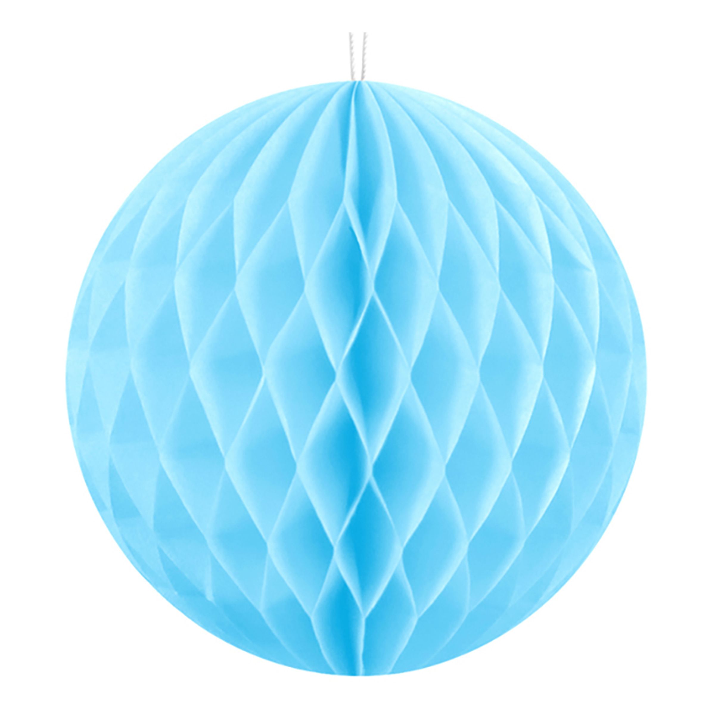 Honeycomb Ljusblå finns i fyra olika varianter: 10, 20, 30 och 40 cm i färgen ljusblå. De är tillverkade av papper och hängs enkelt upp i taket med hjälp av snören och tejp. Säljs i 1-pack.