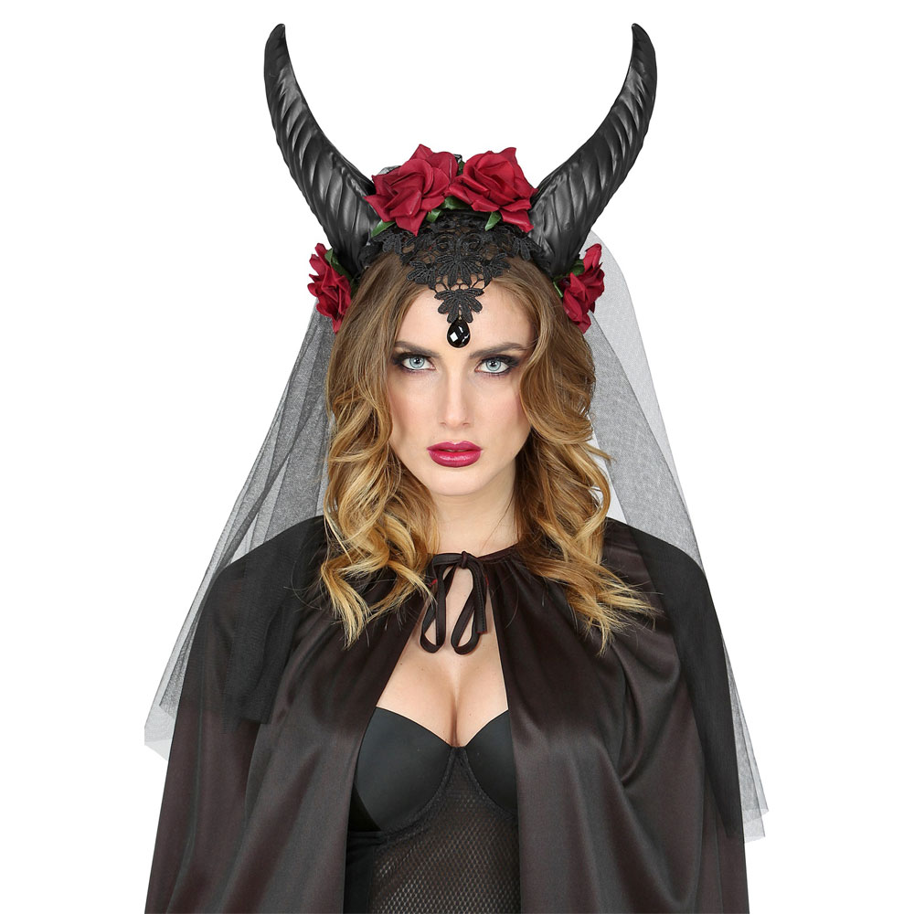 Horn och Slöja Diadem omfattar ett svart diadem med svarta horn, svart slöja och röda rosor samt dekorativt borderystycke framtill. Diademet är tillverkat av plast och polyester och passar vuxna.