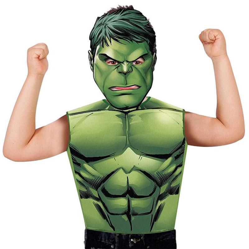 Hulken Partytime Set Barn består av en grön tröja med Hulken mönster och en matchande Hulken mask. Masken har hål för ögon och mun, samt elastiska band på sidorna som håller den på plats.