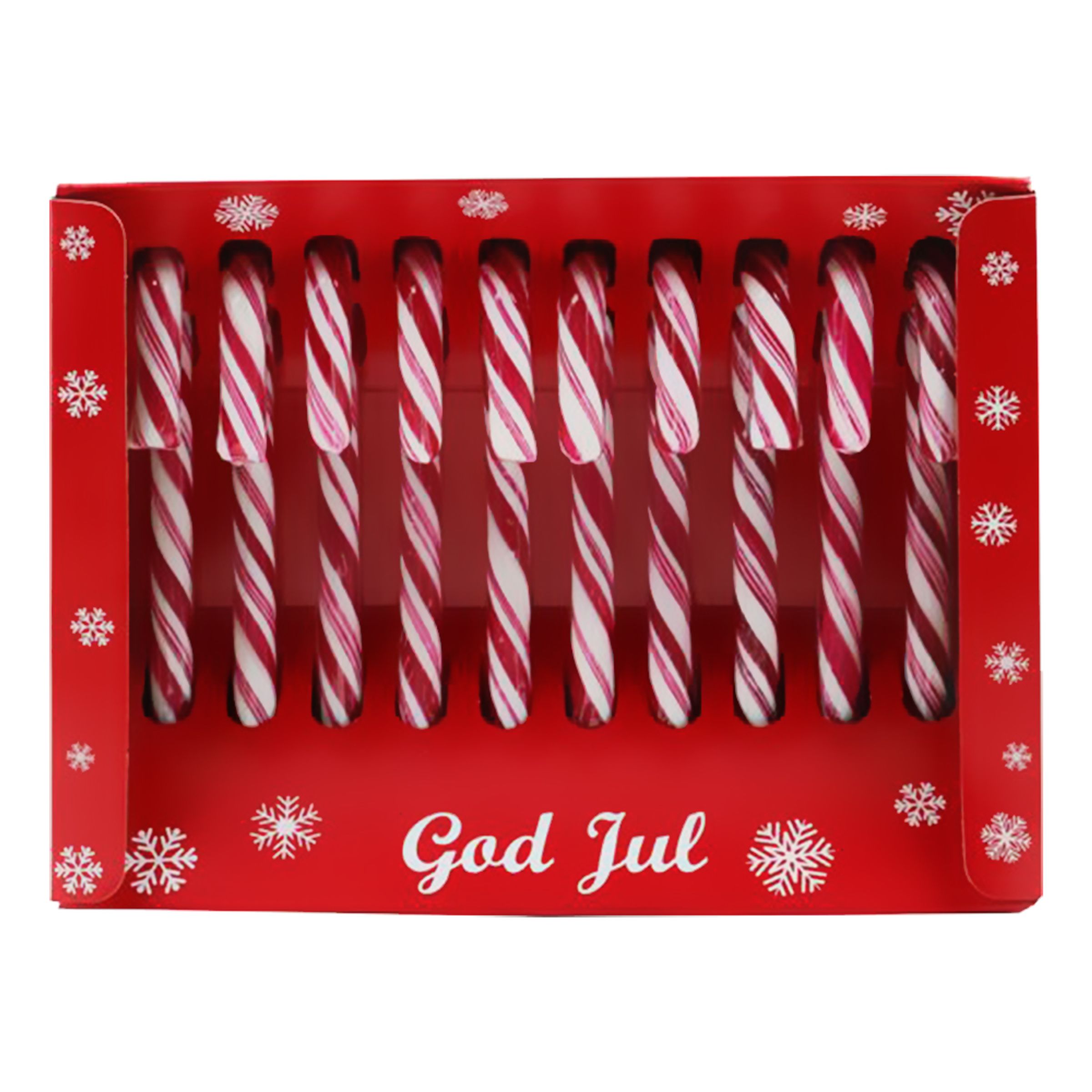 Hulténs Mintkäppar är klassiska polkagriskäppar / julkäppar med smak av pepparmint att hänga upp i julgranen eller äta direkt som julgodis.