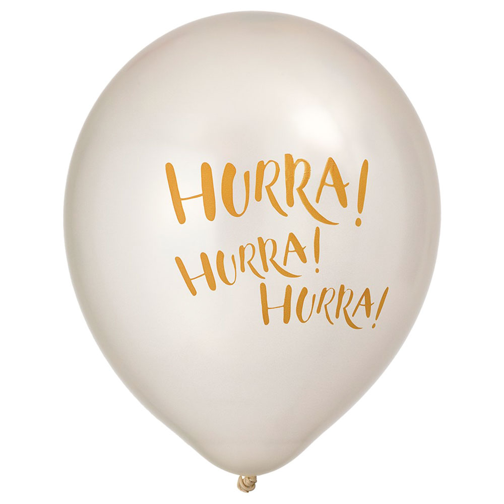 Hurra Ballonger omfattar 6 stycken pärlvita latexballonger med guldig "Hurra! Hurra! Hurra!" text framtill. Ballongerna mäter ca 30 cm i diameter uppblåsta.
