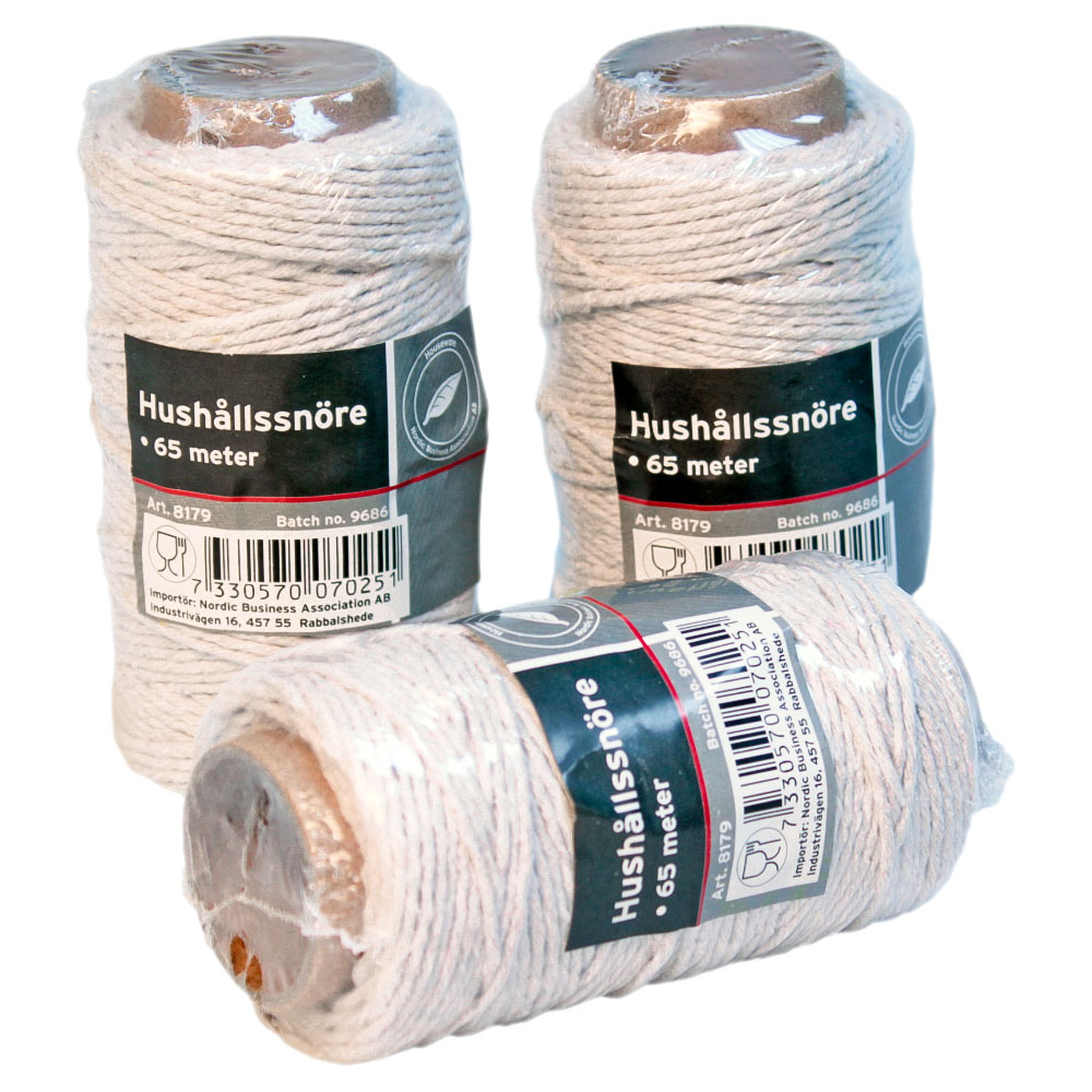 Hushållssnöre består av ett snöre som används för att binda kött m.m. Snöret mäter 65 meter långt och är tillverkat av bomull.