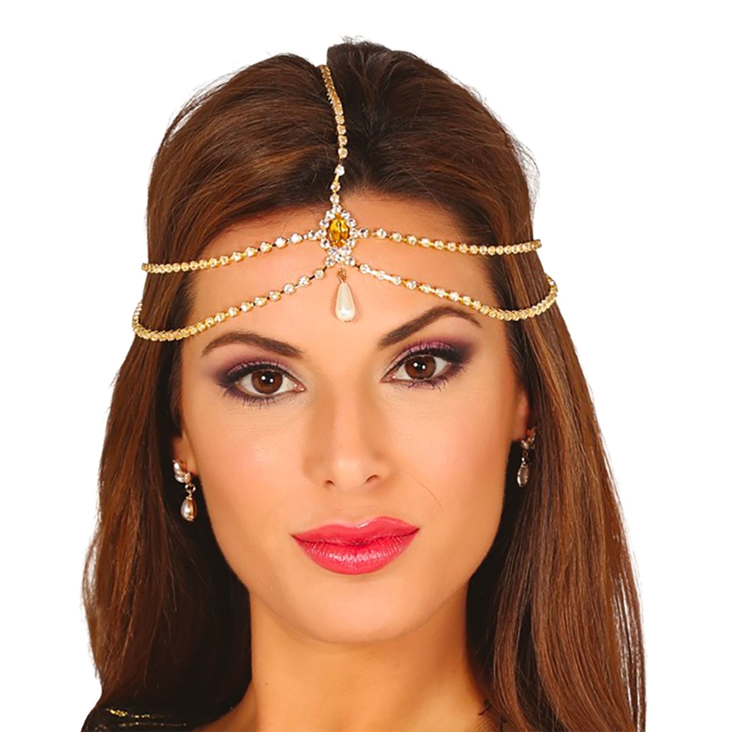 Huvudsmycke med Pärla är ett smycke med skimrande strass i guld med crémevit pärla framtill. Ett superfint och annorlunda maskeradsmycke som passar utmärkt till din 20-talslook eller flapperklänning.