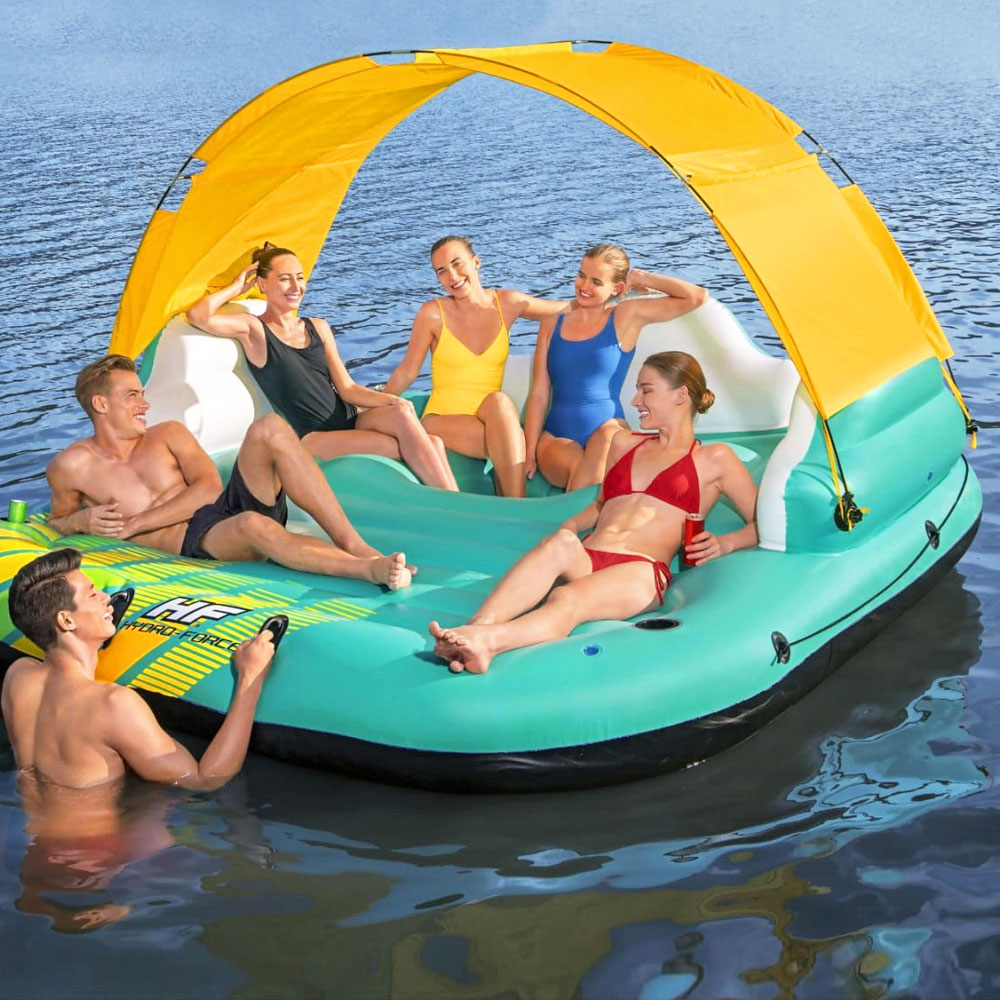 Njut lite extra av sommarens strandbesök med denna häftiga hydro-force badflotte! En riktigt enorm uppblåsbar badflotte med plats för fem vuxna personer. Flotten är dessutom försedd med massa praktiska prylar såsom ett skyddande soltak, praktiska mugghållare och bekväma ryggstöd att luta sig mot. Helt enkelt den ultimata flotten för dig som är ute efter en gigantisk uppblåsbar badmadrass att flyta runt på med dina vänner!