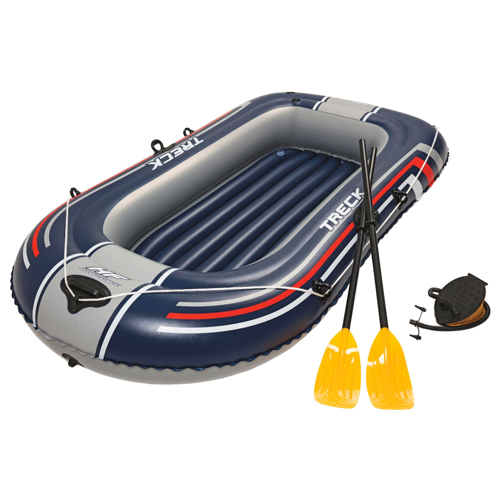 Hydro-Force Uppblåsbar Båt omfattar en uppblåsbar båt av PVC-plast med uppblåsbart golv för extra komfort och stabilitet samt ett rep längst kanten att hålla sig i. Båten är ca 228 cm lång och 121 cm bred, och har en maxvikt på 170 kg. Medföljer även ett par åror och en fot-luftpump.