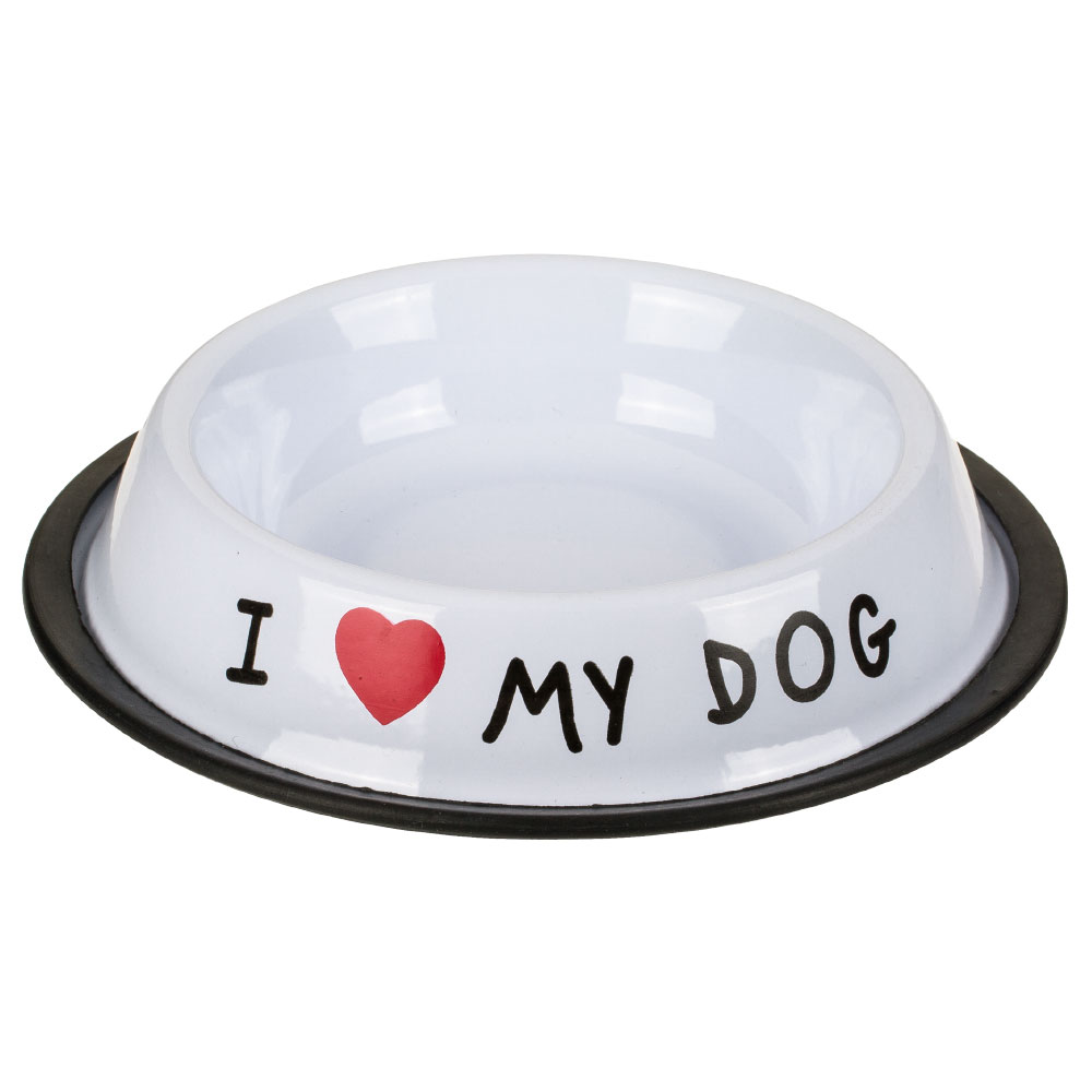 I Love My Dog Hundmatskål består av en skål i rostfri stål med texten "I (love) my dog". Skålen är vit med svart text, rött hjärta och en svart avtagbar gummikant nedtill. Skålen är ca 4,5 cm hög och har en diameter på 21 cm.