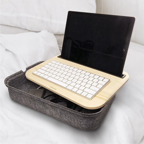 Hålet i locket passar för allt från iPads, iPad Mini, iPad Air, till Kindle, Samsung Galaxy och mer. Förvaringsutrymmet på undersidan är gjort i hårt material och klädd med filt, för att stabilt kunna förvara din egendom och samtidigt kännas bekväm mot benen.