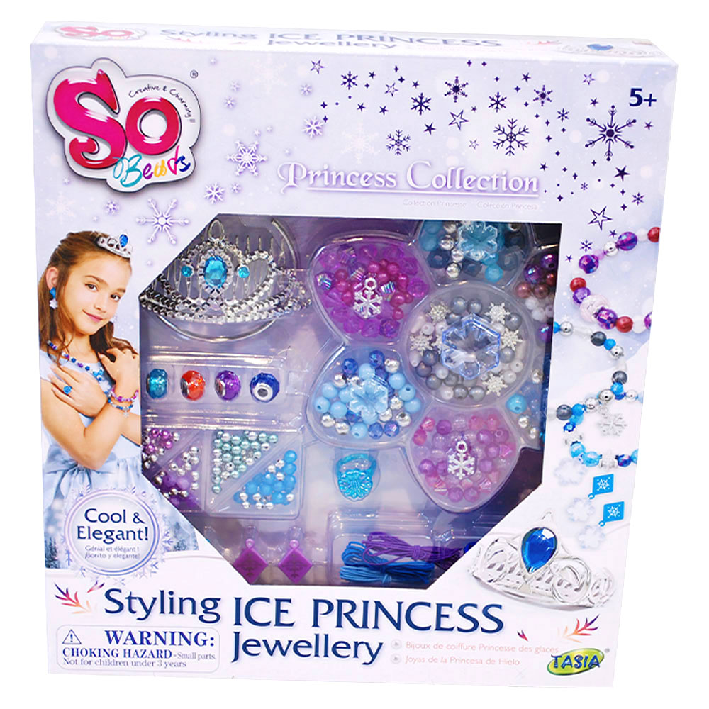 Ice Princess Smyckes Pysselset omfattar ett pysselset med berlocker, pärlor, clipsörhängen, olika snören och ett trådningsverktyg för att göra egna halsband, armband och örhängen. Medföljer även en prinsesstiara och en prinsessring.