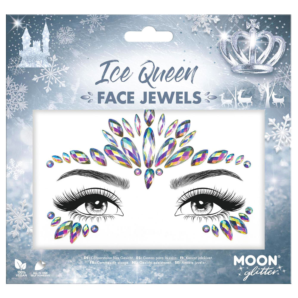 Ice Queen Ansiktssmycken omfattar tre stycken ansiktssmycken med diamanter i silver som skimrar i olika färger. Diamanterna sitter på genomskinliga stickers med självhäftande baksida. Applicera ansiktssmycket genom att försiktigt dra av hela stickern från plasten och tryck det mot ren och torr hud.