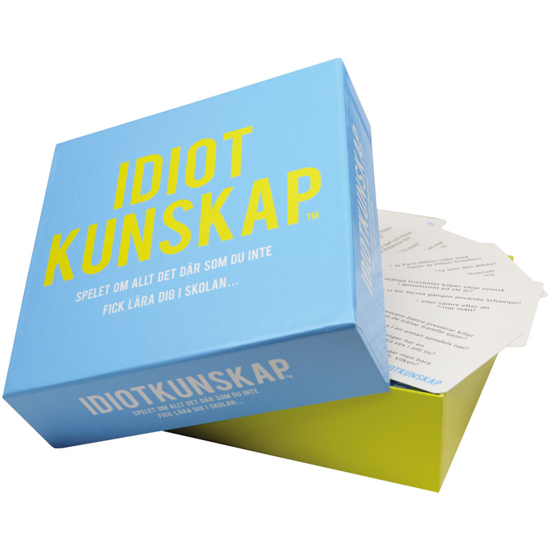 Idiotkunskap Frågespel omfattar ett frågespel med 400 frågekort fullt av onödigt vetande. Speltid varierar efter antal spelare, minst 2 spelare krävs.