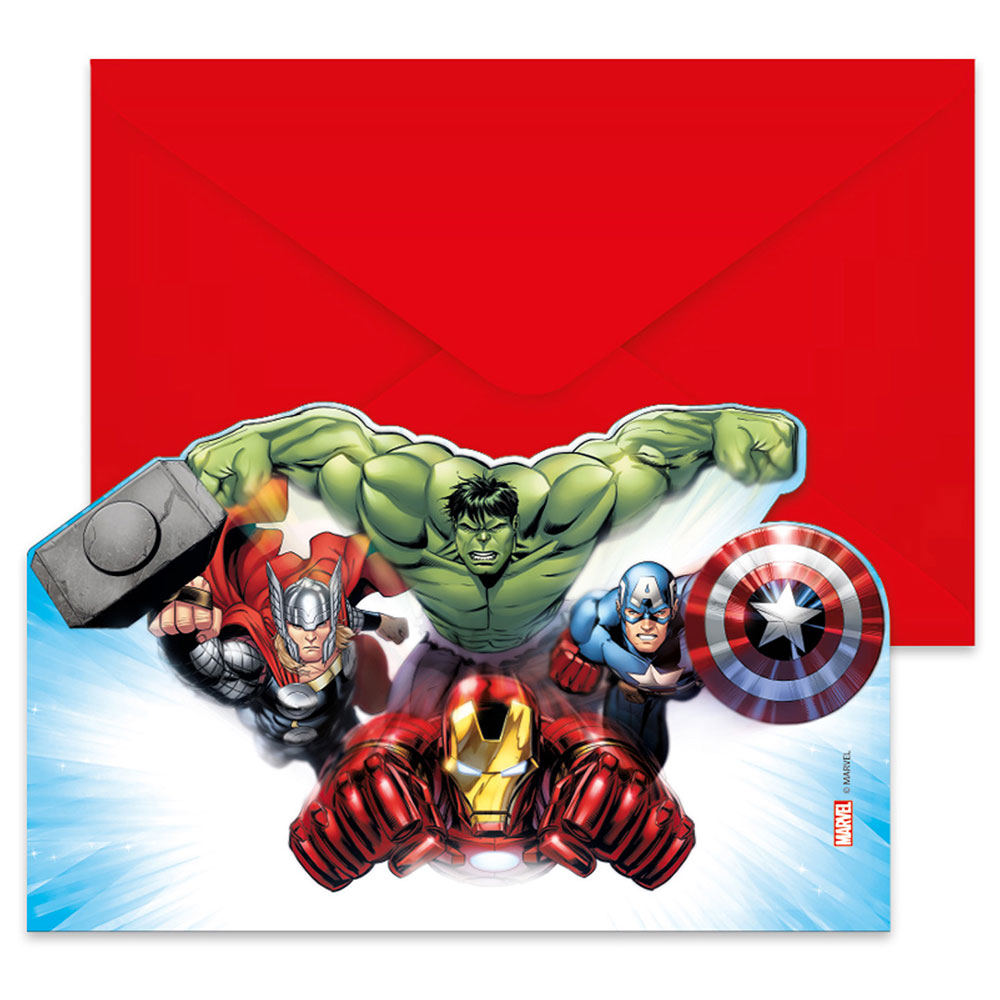 Inbjudningskort Avengers Infinity Stones omfattar 6 st inbjudningskort i papp med motiv av Avengers karaktärer. Korten är ca 14 x 9 cm stora och kommer med röda kuvert.