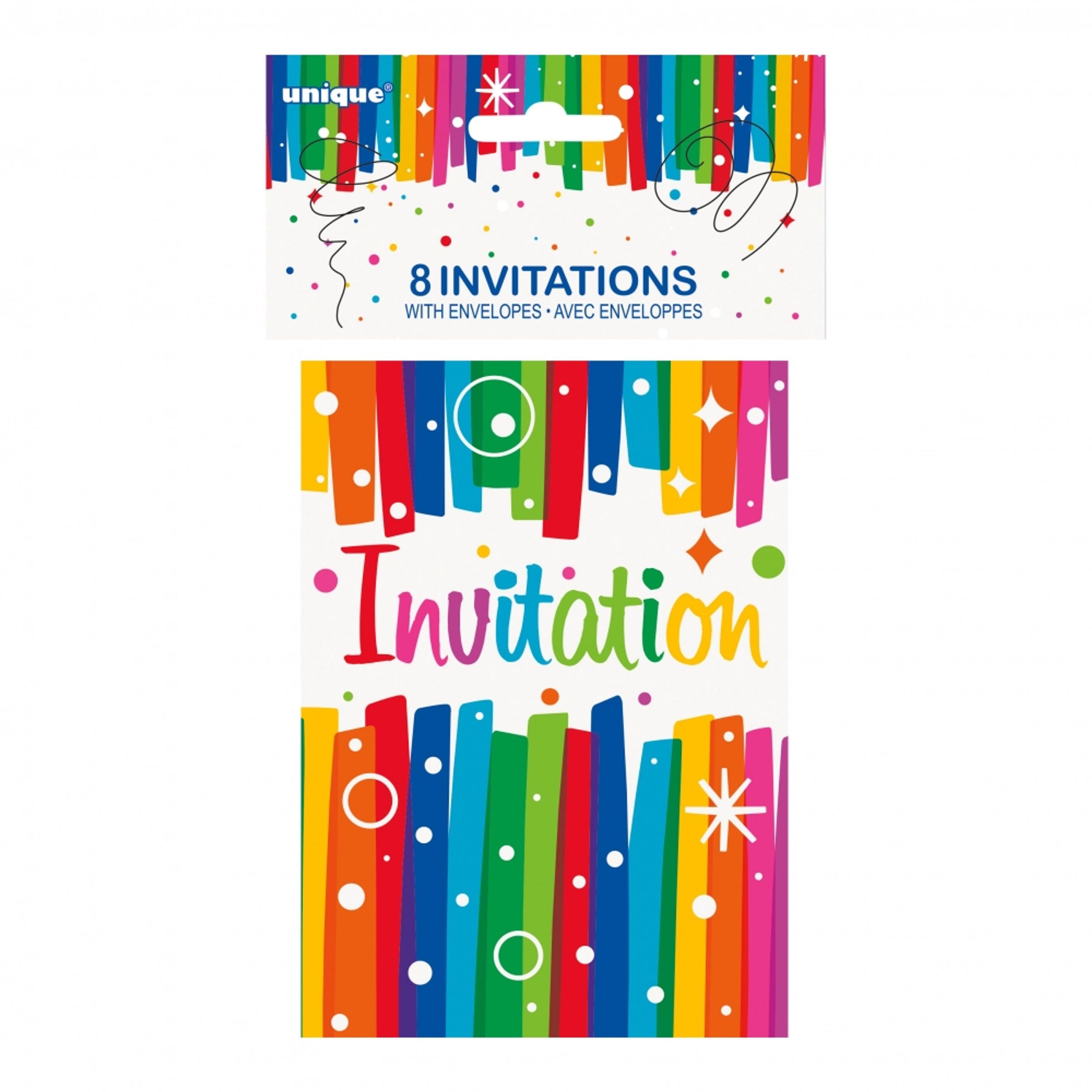Inbjudningskort Födelsedag Regnbåge är ett 8-pack festliga inbjudningskort med ränder som går i flera olika, glada färger. Korten har fallande, vit konfetti över ränderna samt ett vitt parti på mitten med texten "Invitation".