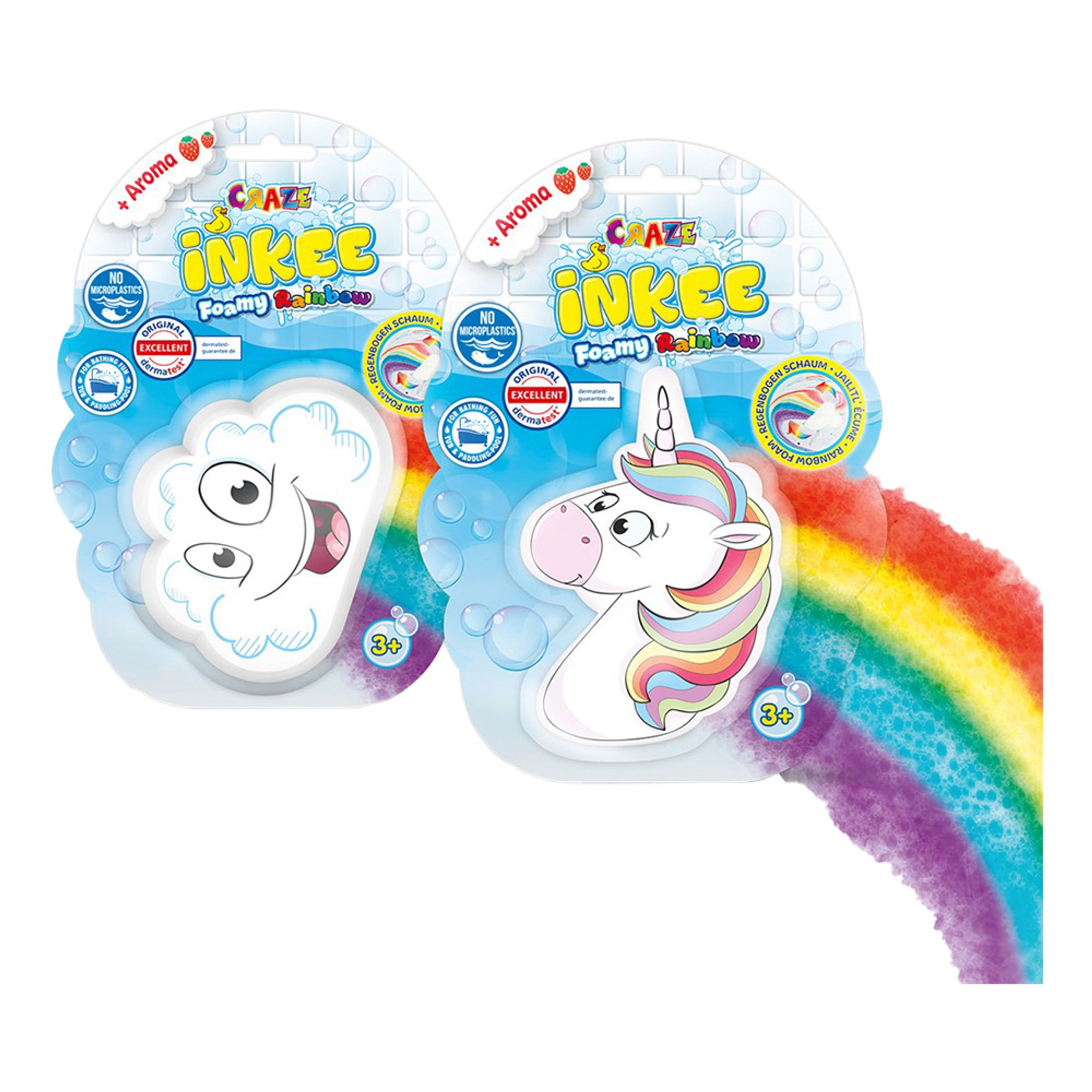 Inkee Badbomb Regnbåge levereras styckvis och osorterat vilket betyder att motivet du får (moln eller unicorn) blir en överraskning. När du släpper i badbomben i vattnet ger den ifrån sig ett regnbågsliknande skum med doft av jordgubb.
