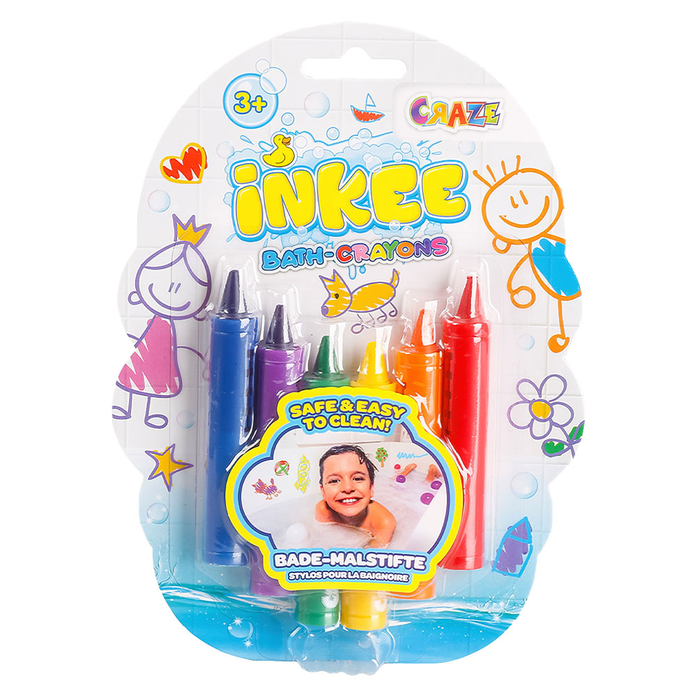 Inkee Badkarskritor omfattar ett 6-pack badkartskritor i färgerna blått, lila, grönt, gult, orange och rött. Kritorna är ca 9 cm stora, är enkla att tvätta bort och kan användas på badkar och på kakelväggar.