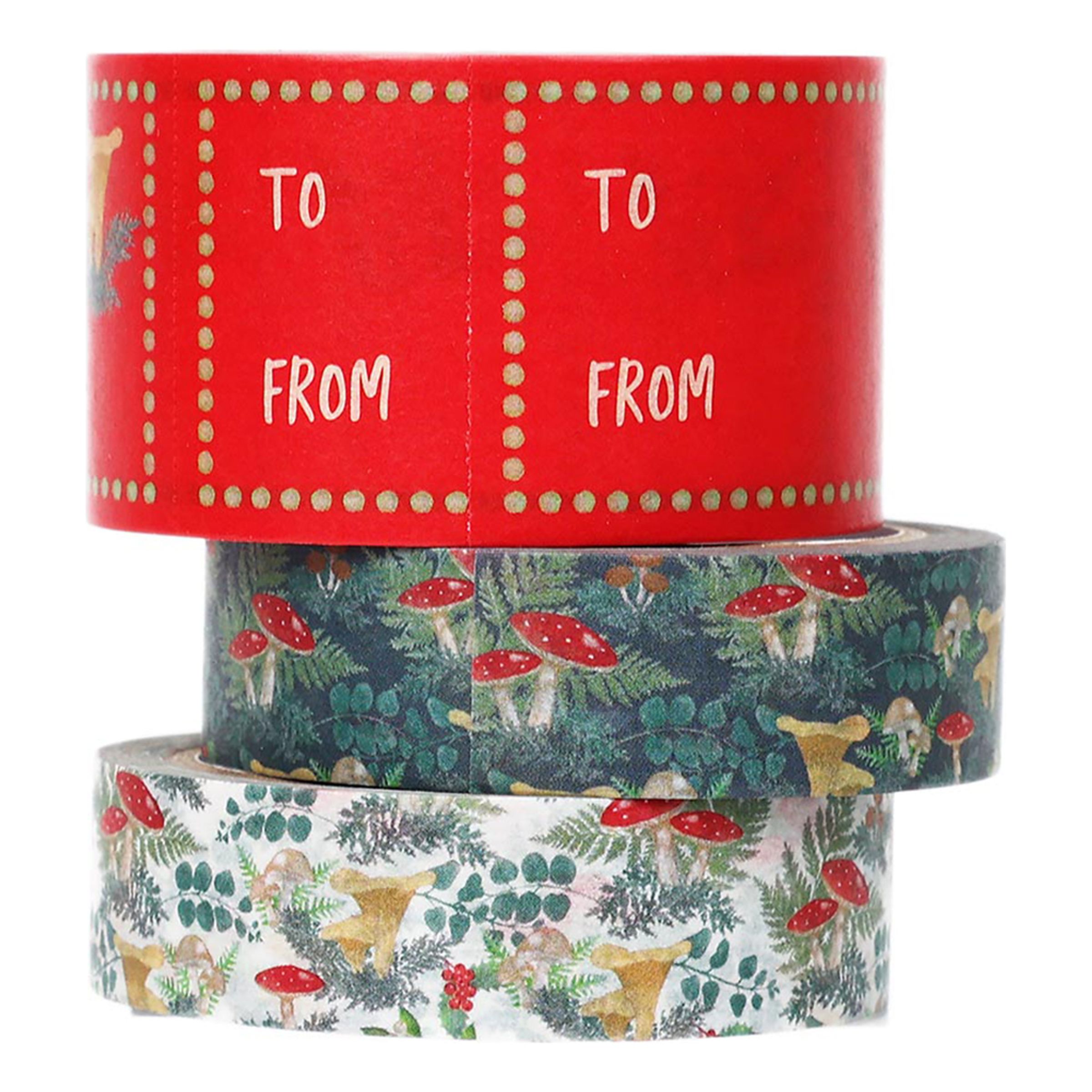 Inslagningskit Jul Forest innehåller en röd tejprulle med 140 stycken juletiketter, samt två tejprullar á 10 meter med fina julmotiv av röda svampar och grönska. Ett ypperligt kit när det är dags att slå in alla julklappar!