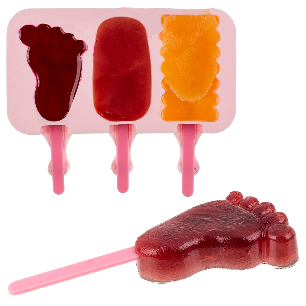 Isglassform Silikon Mix omfattar en silikonform med plats för tre isglassar. Formarna fylls med valfri isglass eller fruktmix och läggs i frysen för att stelna. Glassarna är ca 8,5 cm höga, 5 cm långa och 2,5 cm breda. Pinnar ingår.