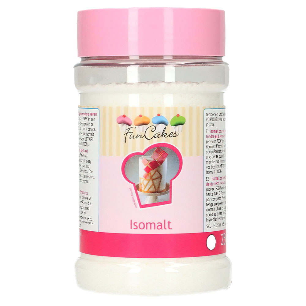 Isomalt består av 250 gram isomalt som kan användas som sötningsmedel och för dekorationer som liknar glas. Smält isomalt i mircon eller i en kastrull. Rör om var tjugonde-trettionde sekund tills den är helt smält och färga och/eller forma isomalten hur du vill.