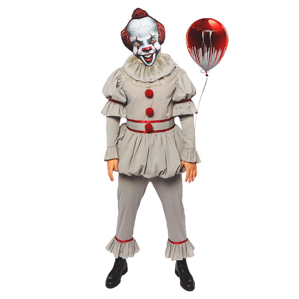 IT Pennywise Clown Dräkt omfattar en Pennywise dräkt från skräckfilmen IT. Maskeraddräkten passar vuxna och kommer med en långärmad, grå tröja med stora volanger och röda detaljer, ett par matchande byxor samt en Pennywise mask av plast. Masken täcker hela ansiktet och har hål för ögon och mun. Dräkten är gjord i polyester.