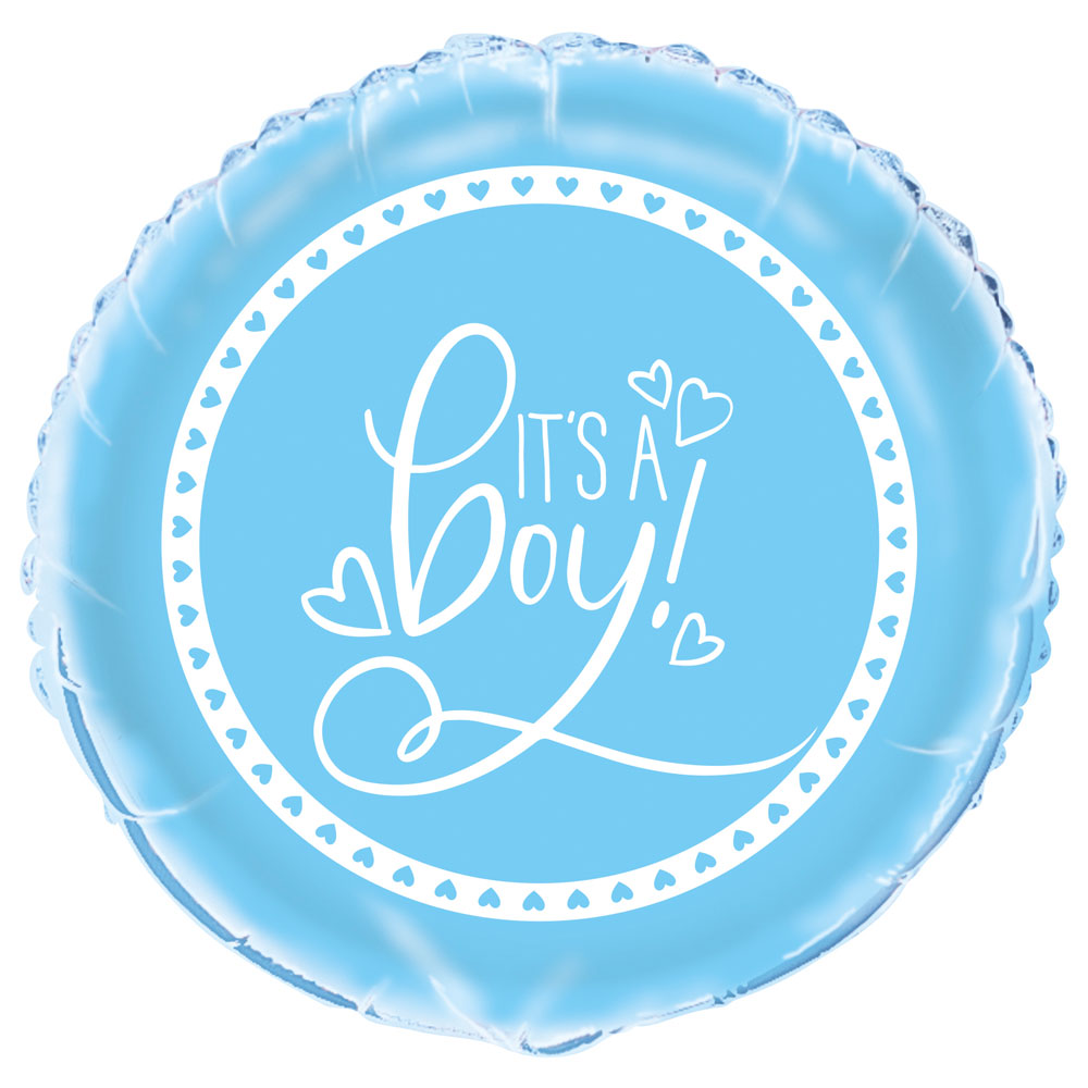 It's A Boy Folieballong omfattar en rund folieballong i metallic ljusblått med hjärtmotiv och texten "It's A Boy!" i vitt.