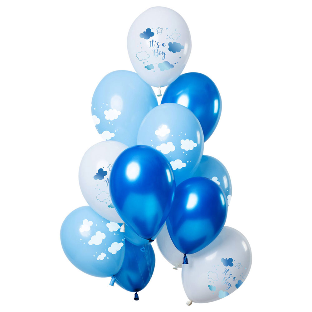 It's A Boy Latexballonger Mix består av metallic blåa ballonger, ljusblåa ballonger med molnmotiv och vita ballonger med molnmotiv och "Its A Boy" text.