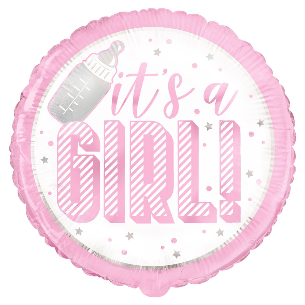 It's a Girl Folieballong Rosa & Vit omfattar en rund folieballong i vitt och rosa med texten "It´s a girl" och motiv av en nappflaska och stjärnor. Ballongen rymmer ca 18 liter, blir ca 45 cm stor och har självförslutande ventil. Blås upp med helium eller luft.