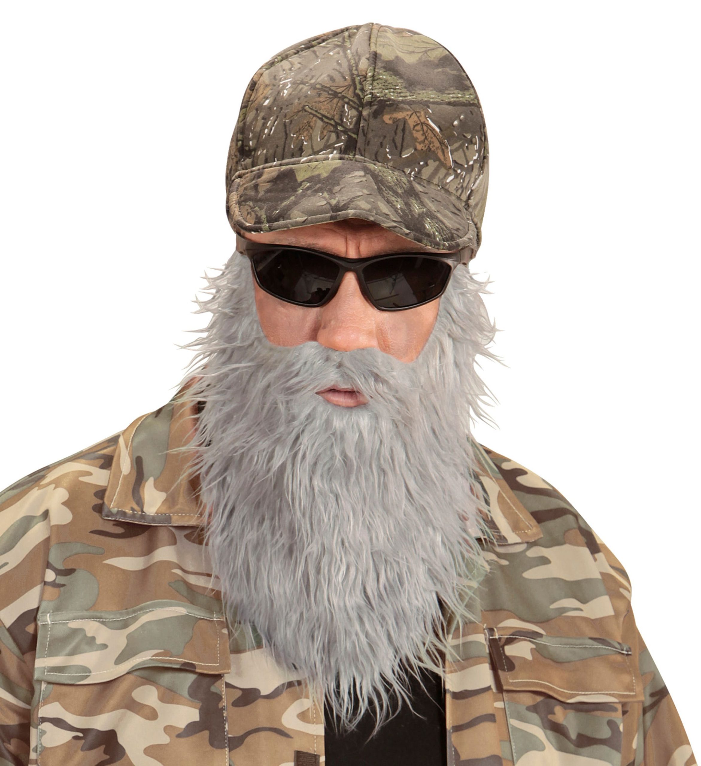 Jägare Keps & Skägg består av en kammouflerad keps och ett grått skägg med mustasch som du fäster bakom öronen med elastiska band.