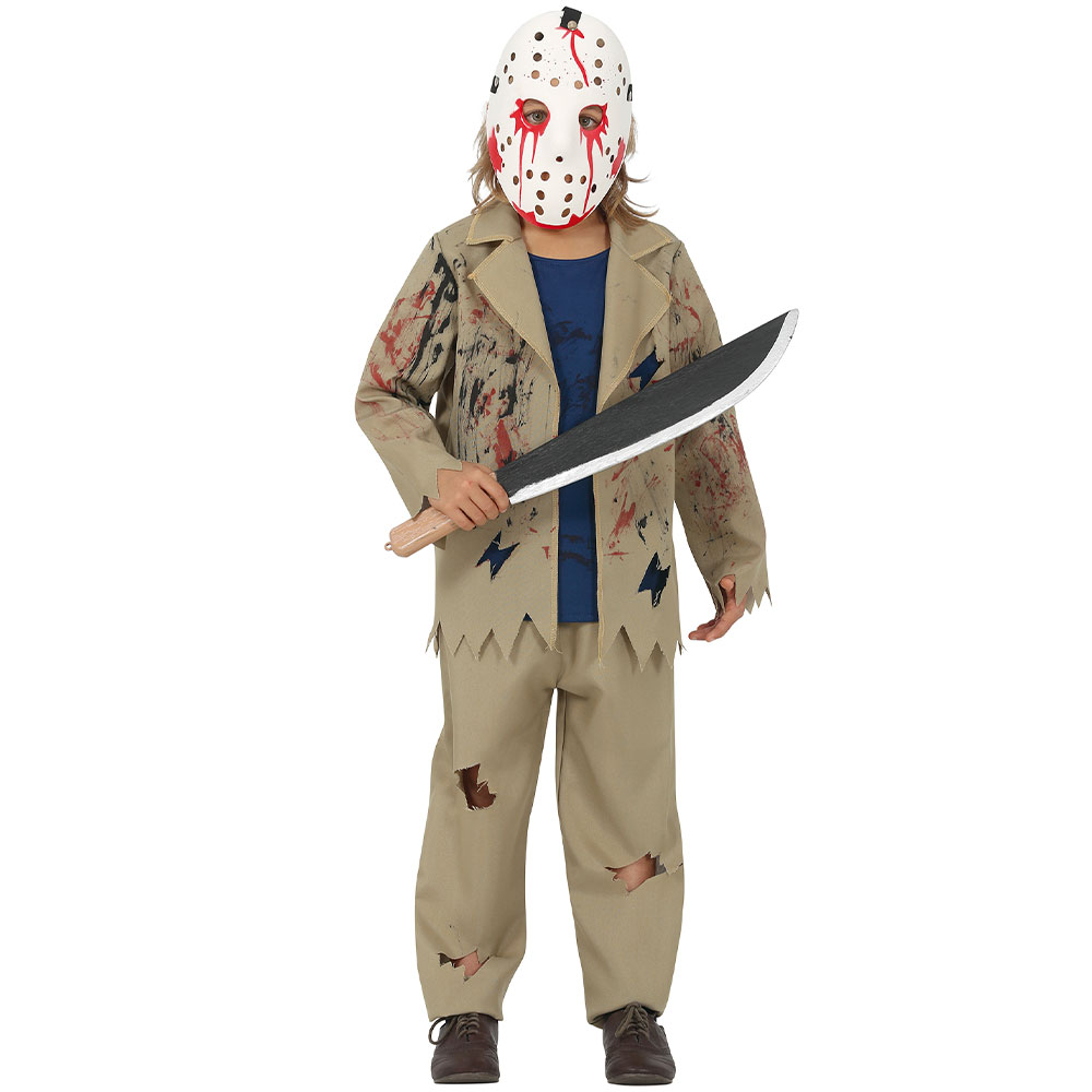 Jason Maskeraddräkt Barn omfattar en barndräkt med Jason Voorhees motiv från filmen "Friday the 13th". Dräkten inkluderar en blodig beige jacka med en lila fastsydd tröja, ett par beige byxor samt en vit 3D-mask med ögonhål.