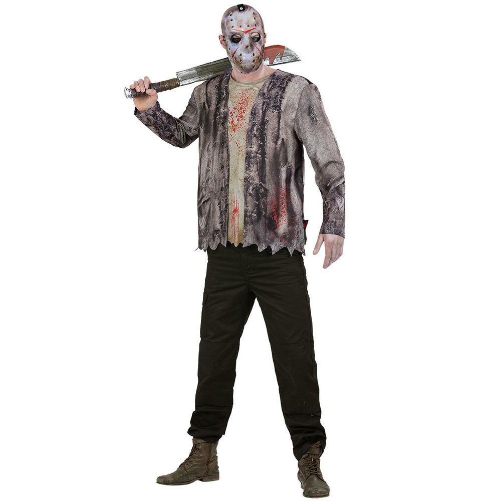 Jason Maskeraddräkt med Mask omfattar en maskeraddräkt med rött blodstänk och motiv av Jason från filmen "Friday the 13th". Dräkten inkluderar en mask och grå jacka med en fastsydd beige T-shirt.
