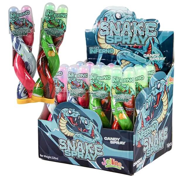 Jellioo Inferno Double Snake Spray är en spännande och sur godisupplevelse där du kan spruta två olika sura smaker, som en orm, direkt i munnen. Perfekt för den som gillar sura smaker och en lekfull godisupplevelse!