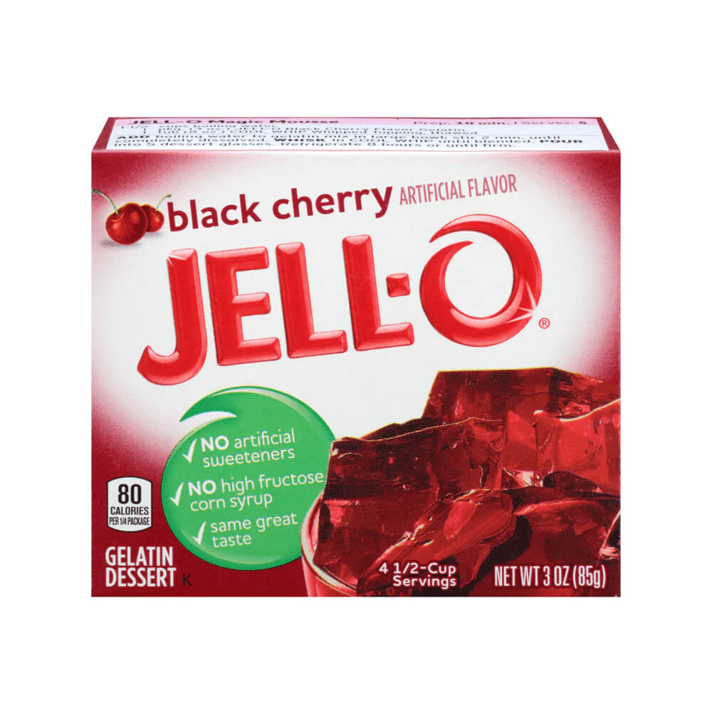 Jell-O är en amerikansk gelédessert som bereds genom att blanda det smaksatta gelatinpulvret med enbart vatten. Jell-O har en härlig konsistens som uppskattas av både stora och små och denna med smak av svart körsbär är riktigt smarrig.