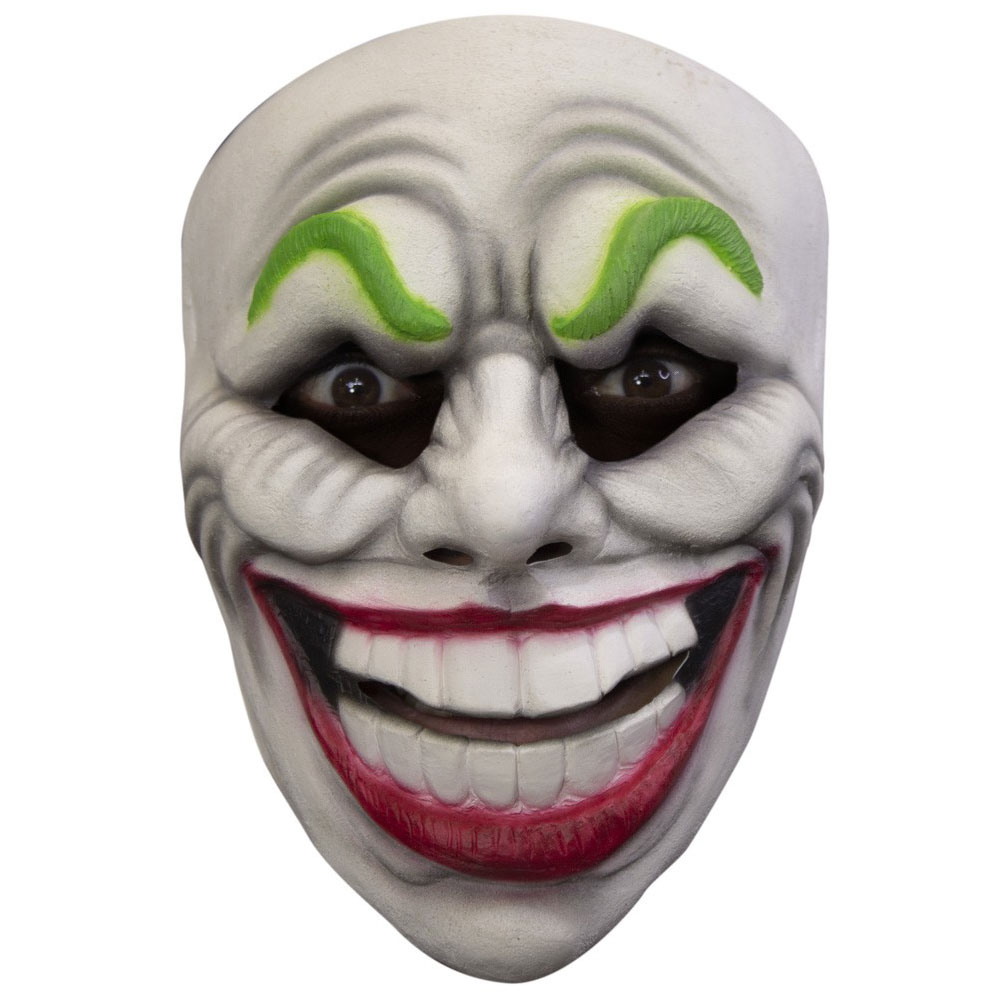 Jester Latexmask omfattar en clownmask med Jester motiv. Masken har hål för ögon, näsa och mun, och hålls på plats med ett svart elastiskt band.