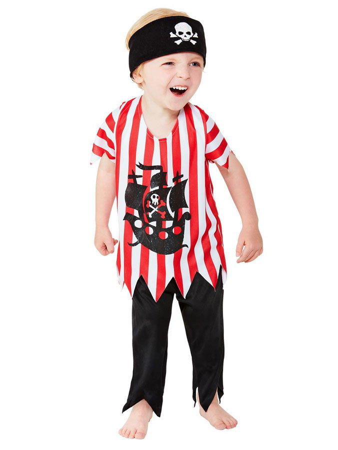 Jolly Pirate Maskeraddräkt Barn innehåller en röd-vit randig pirattröja med svart motiv av ett piratskepp, svarta piratbyxor samt ett svart pannband med vit döskalle.