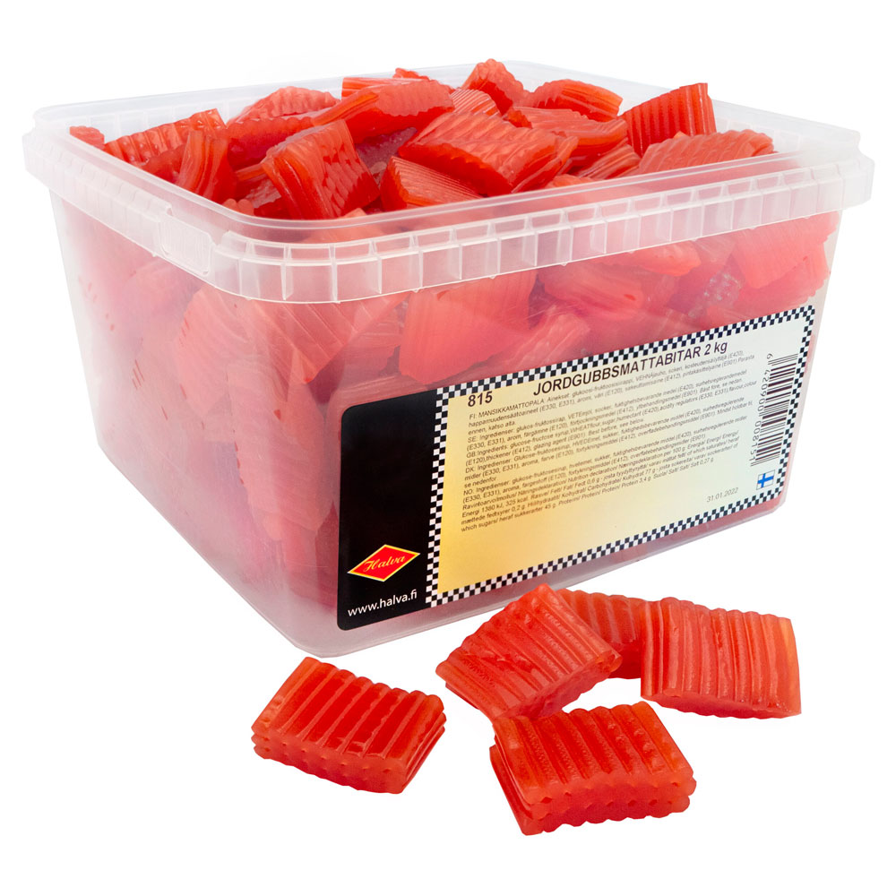 Jordgubbsmatta 2 kg omfattar 2 kg godis med smak av jordgubbar.