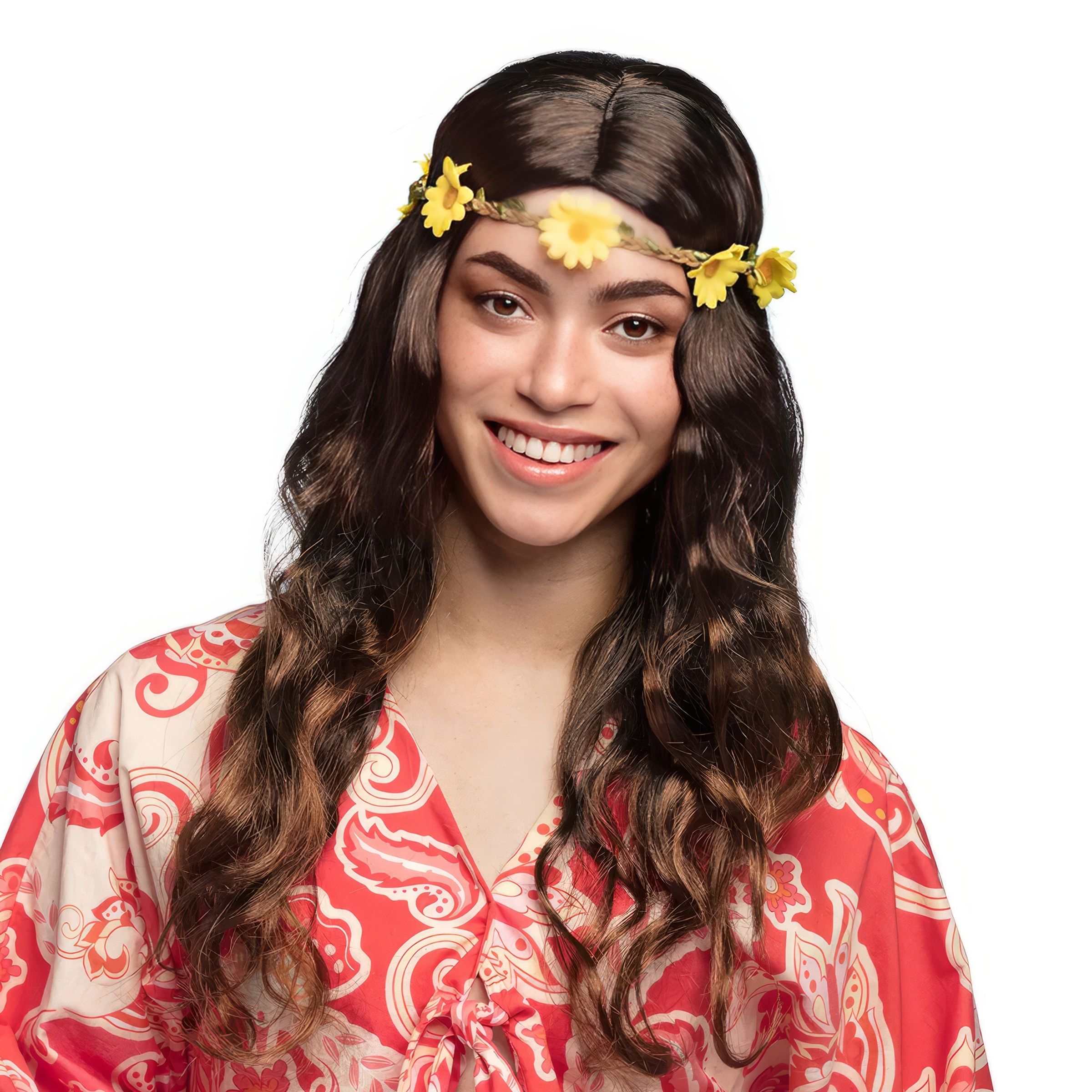 Joy svart/brun peruk med pannband är en hippieinspirerad peruk med vågiga lockar och ett dekorativt hårband av gula plastblommor som föreställer små solrosor. Nu är det bara de batikfärgade kläderna, brillorna och fransarna som saknas innan du är en tvättäkta hippie. Det är peace (piece) of cake!