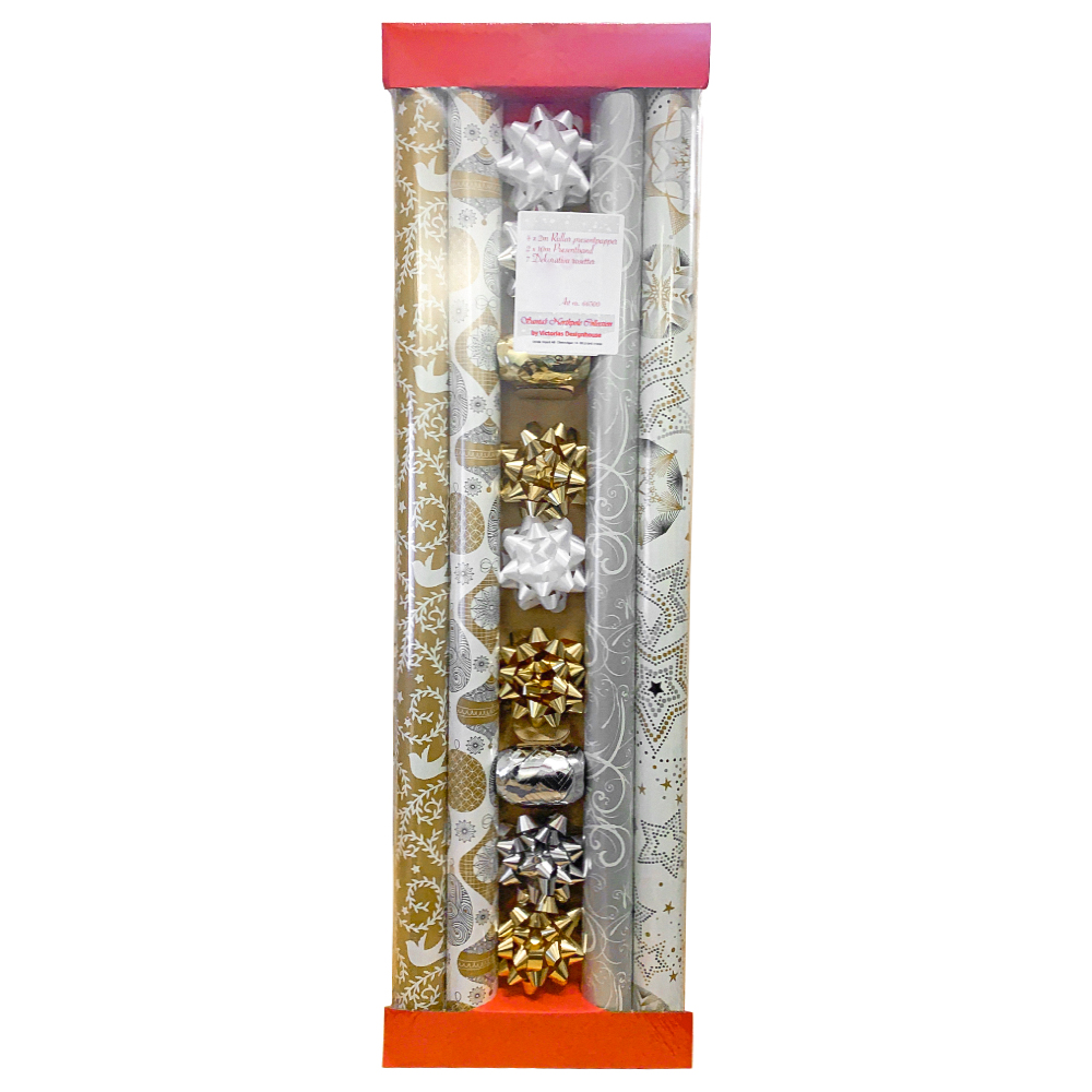 Här har du ett kit med snygga present-snören, papper och rosetter, dessa inslagningspapper kommer göra dina paket riktigt fina! Julpapper i vitt, guld, silver och svart som passar till alla inslagningar som kommer i din väg.