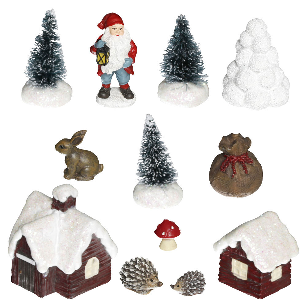 Julby med Tomte omfattar en julby i polyresin med 12 olika delar som är ca 6 cm stora. Julbyn innehåller figurer i form av en tomte, hus, granar, igelkottar, en hare, en svamp, en säck och en snölykta.