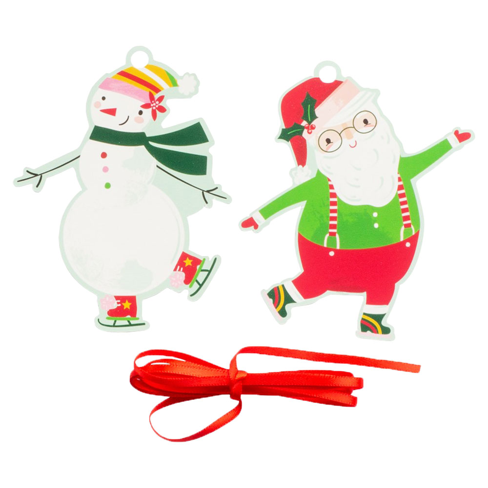 Juletiketter med Snöre Tomtar & Snögubbar omfattar 6 stycken juletiketter i papp med tillhörande rött sidenliknande band. Etiketterna föreställer skridskoåkande snögubbar och och färgglada tomtar, du får tre stycken etiketter av varje motiv. Etiketterna är ca 8,5 cm långa och 6,5 cm breda.