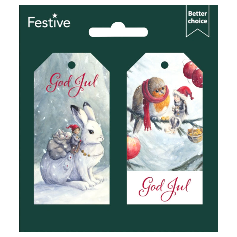 Juletiketter Pyssling består av juladresser med pysslingmotiv. En etikett mäter ungefär 8 centimeter i längd och 4 centimeter i bredd. Juletiketterna säljs i 12-pack varav 6 stycken av varje motiv.