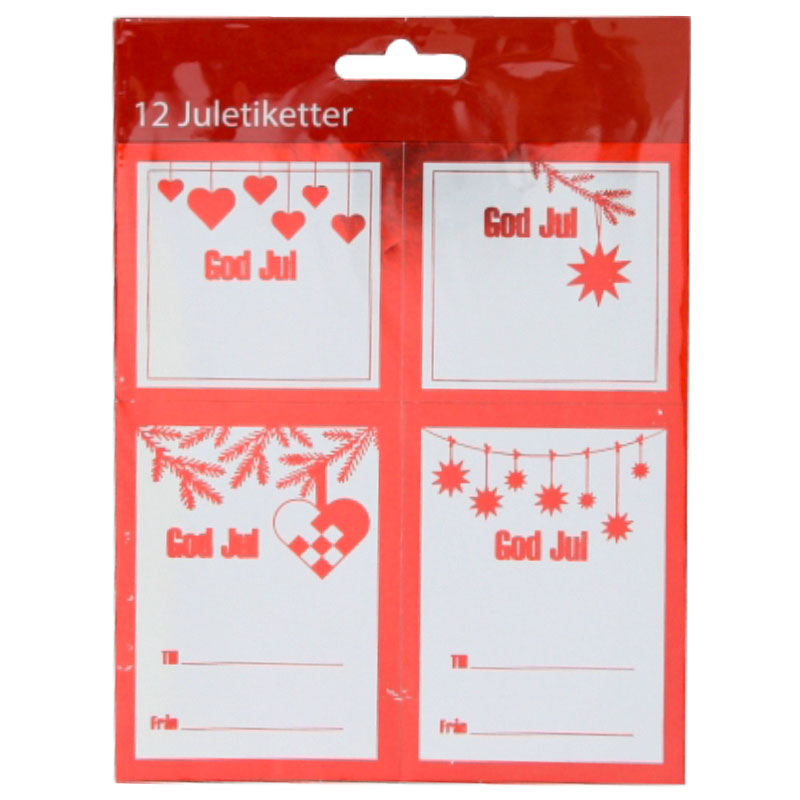 Juletiketter Stickers Röd Metallic består av juladresser med juliga motiv, texten God Jul och kanter i glänsande röd färg. Arken mäter 15,5 centimeter i längd och 13,5 centimeter i bredd. En förpackning innehåller två likadana ark med sammanlagt 12 stycken juletiketter.